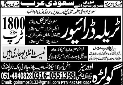 Golra Overseas Recruiting Agency latest Overseas Driving jobs and others can be applied till 25 June 2025 or as per closing date in newspaper ad. Read complete ad online to know how to apply on latest Golra Overseas Recruiting Agency job opportunities. Salary varies from 136000.