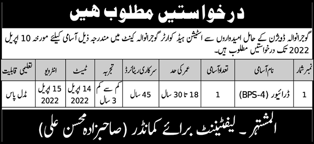 Station Headquarters Gujranwala, gujranwala Punjab Pakistan invites applications from eligible candidates for the post of driver as per advertisement of April 7, 2022 published in daily Nawaiwaqt Newspaper. Candidates with Middle etc. educational background will be preferred.