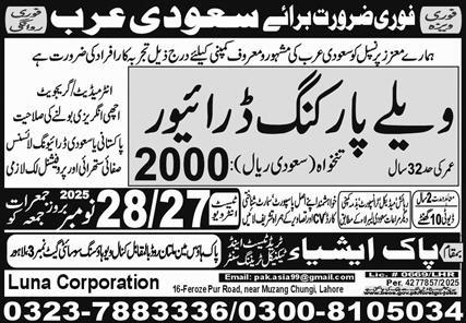 Pak Asia Trade Test & Technical Training Center jobs advertisement dated about 26 November 2025 in daily Express Newspaper invites application for the vacant post of valet parking driver and driver in Dammam, al khobar Saudi Arabia. Persons with Matric and Intermediate etc. education can apply.