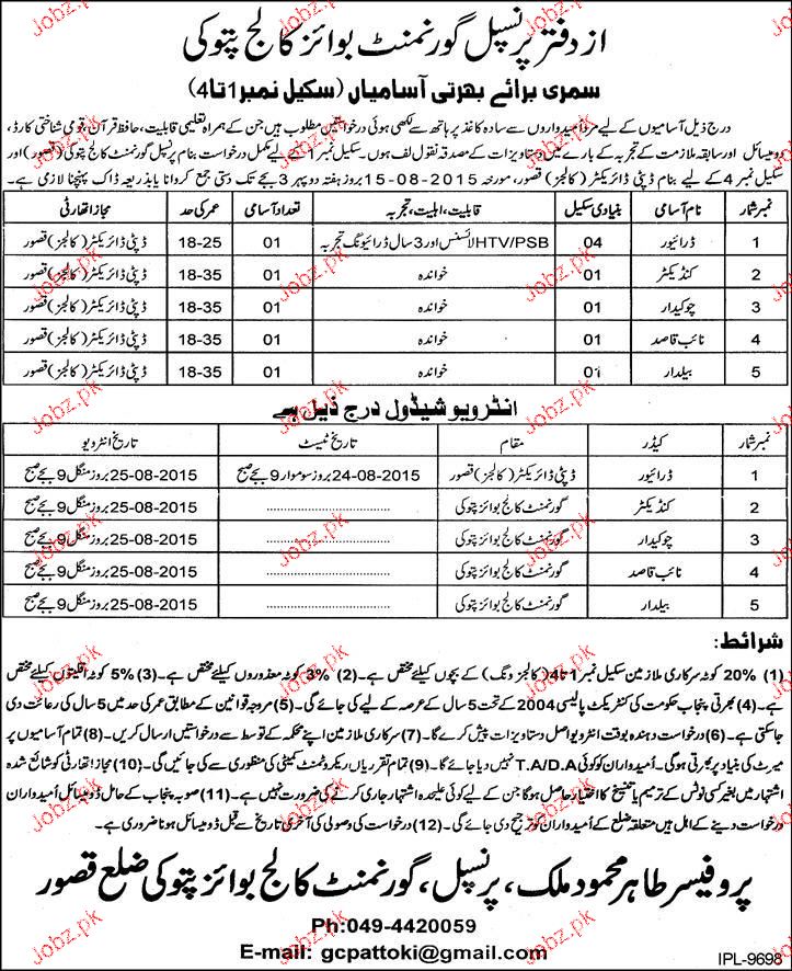 Drivers, Conductors, Chawkidars, Naib Qasid and Baildars are required in Government Boys College in Patoki.