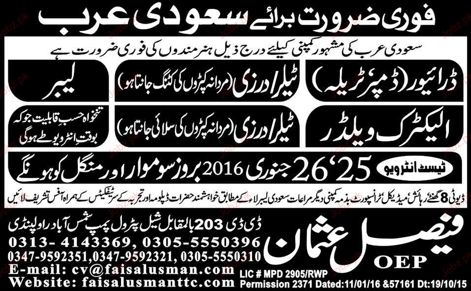 Drivers, Electric Welders, Tailors and Labors Wanted