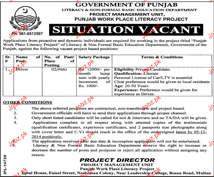 Drivers Job in Literacy & Non Formal Basic Education Departm