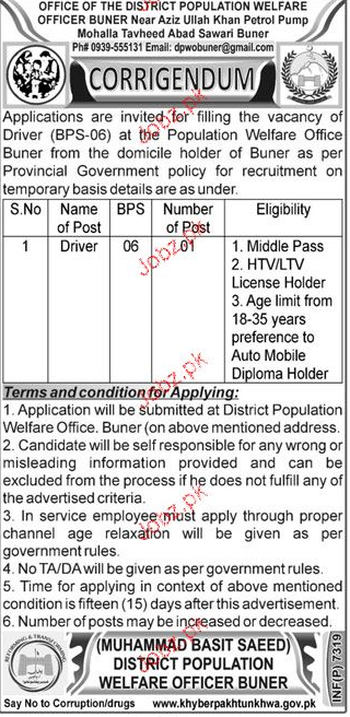 Latest Population Welfare Department Driving Posts Bannu 2025