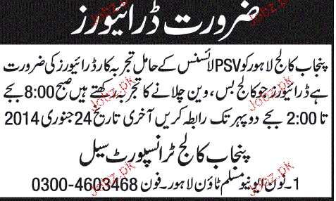 Drivers are required in Punjab College Transport Cell in Lahore.