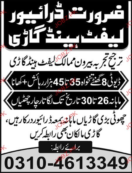 Drivers who can drive left handed vehicles and all other type of vehicle are required in Lahore. duty duration will be eight hours in a day and salary will be paid from 35000 to 45000.