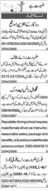 Private Company Islamabad, islamabad Islamabad Pakistan invites applications from eligible candidates for the post of receptionist, driver, chowkidar, house worker, electrician, office staff, driving instructor, fauji guard, security guard, cook, office boy and female office staff as per advertisement of August 14, 2024 published in daily Express Newspaper. Preferred Education is BA, Bachelor, Matric, Intermediate and Middle etc.
