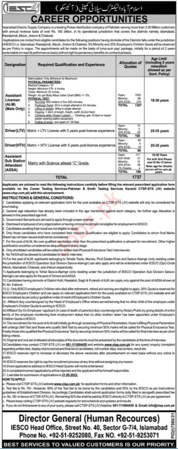 Islamabad Electric Supply Company IESCO jobs advertisement dated about 15 May 2022 in daily Ausaf Newspaper invites application for the vacant post of Assistant Lineman, Assistant Sub Station Attendant, Driver Htv, Driver and Driver Ltv in Islamabad, islamabad Islamabad Pakistan. Educational qualifications required Matric etc.