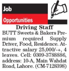 Butt Sweets & Backers Lahore, lahore Punjab Pakistan invites applications from eligible candidates for the post of driver and ltv driver as per advertisement of January 18, 2023 published in daily The News Newspaper. Preferred Education is Primary and Middle etc.