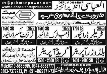 Al Abbasi Enterprises Saudi Arabia, saudi arabia Saudi Arabia invites applications from eligible candidates for the post of grader operator, bulldozer operator, transit mixer driver, demp truck driver and tralla driver as per advertisement of December 14, 2023 published in daily Express Newspaper. Intermediate, DAE, Middle and Matric etc. educational qualification will be preferred.