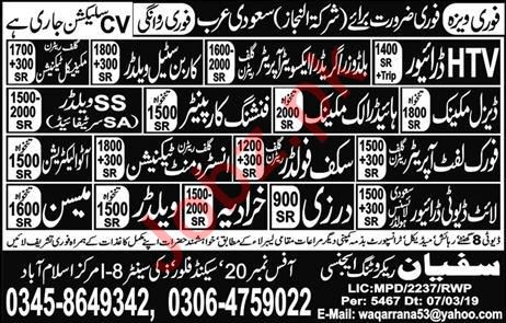 A well reputed company is looking for HTV Driver, Buldozzer Operator, Carbon Steel Welder, Mechanical Technician, Diesel Mechanic, Scuff Folder, Finishing Carpenter, Welder, Fork Lift Operator, Auto Electrician, LTV Driver, Tailor, Lathe Machine Operator, Mason in Saudi Arabia.