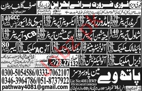 Technical and hardworking personnel for the positions of Grader Operator, Bulldozer Operator, Exporter Operator, HTV Driver, Heavy Driver, Shovel Operator, Lathe Machine Operator, JCB Operator, Hydraulic Mechanic, Auto Dentor, Painter, Boring Machine Operator, Auto AC Mechanic, Labor, Diesel Mechanic and Auto Electrician required for oversea company in Bahrain.