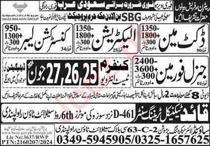 Quaid Technical Training Center Madina, madina Saudi Arabia invites applications from eligible candidates for the post of construction labor, general foreman, electrician and ducket man as per advertisement of June 23, 2024 published in daily Express Newspaper. Preferred Education is Primary, Matric and Middle etc.