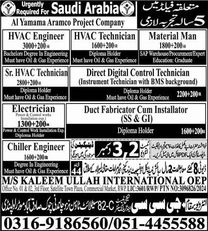 GCC Techni Test & Training Center Riyadh, tabuk Saudi Arabia invites applications from eligible candidates for the post of electrician, material man, chiller engineer, direct digital control technician, hvac technician, duct fabricator, hvac engineer and duct installer as per advertisement of November 29, 2024 published in daily Express Newspaper. Persons with Matric, B.E, DAE, Intermediate and Bachelor etc. education can apply.