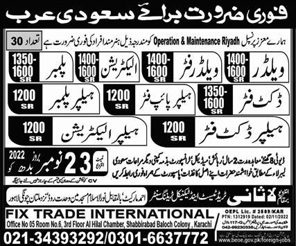 Fix Trade International Riyadh, riyadh Saudi Arabia invites applications from eligible candidates for the post of helper duct fitter, helper pipe fitter, welder fitter, welder, helper plumber, duct fitter, electrician, helper electrician and plumber as per advertisement of November 22, 2022 published in daily Express Newspaper. Persons with Middle, Intermediate and Matric etc. education can apply.