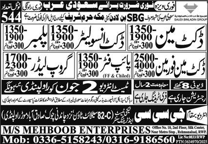 Vacant posts including duct man, duct insulator, pipe fitter, group leader, plumber and duct man foreman are announced in GCC Techni Test & Training Center Makkah, riyadh Saudi Arabia as per 28 May 2025 advertisement in daily Express Newspaper. Candidates with Intermediate, DAE, Bachelor and Matric etc. educational background will be preferred.