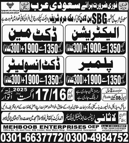 Al Noor MDF Lasani jobs advertisement dated about 14 August 2025 in daily Express Newspaper invites application for the vacant post of electrician, duct insulator, duct man and plumber in Jeddah, taif Saudi Arabia. Candidates with Matric and Intermediate etc. educational background will be preferred.