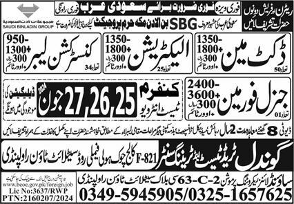 Vacant posts including electrician, duct man, general foreman and construction labor are announced in Sound Lines Recruiting Promotion Riyadh, riyadh Saudi Arabia as per 25 June 2024 advertisement in daily Express Newspaper. Educational qualifications required Matric and Middle etc.