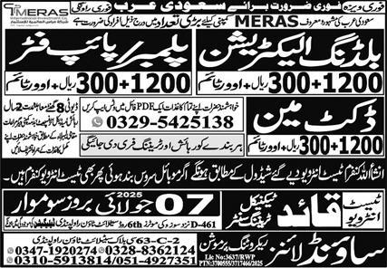 Quaid Technical Training Center is looking for candidates for following posts as per job advertisement published in daily Express Newspaper of July 5, 2025 for location Riyadh, taif Saudi Arabia: