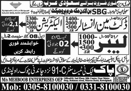 Vacant posts including labor, duct man installer, electrician and duct man are announced in Pak Techni Test Center Makkah, madina Saudi Arabia as per 2 July 2024 advertisement in daily Express Newspaper. Preferred Education is Intermediate, Matric, Middle and DAE etc.
