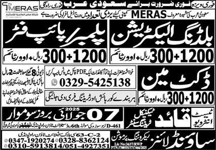 Sound Lines Recruiting Promotion jobs advertisement dated about 3 July 2025 in daily Express Newspaper invites application for the vacant post of duct man, building electrician, pipe fitter and plumber in Jeddah, madina Saudi Arabia. Candidates with Intermediate and Matric etc. educational background will be preferred.