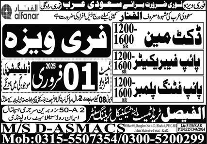 Vacant posts including pipe fabricator, duct man and pipe fitting plumber are announced in Al Faisal Trade Test & Technical Training Center Jeddah, taif Saudi Arabia as per 29 January 2025 advertisement in daily Express Newspaper. Preferred Education is Matric, Intermediate and DAE etc.