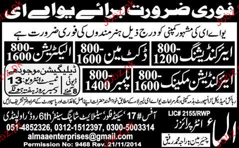 Ductman, Electricians, AC Mechanics Job Opportunity