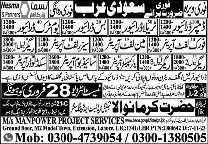 Vacant posts including fork lift operator, main lift operator, side boom operator, dumper driver, rigger, bus driver, skid loader operator, traila driver, boom truck driver, seizer lift operator and roller compacter operator are announced in MS Manpower Project Services Riyadh, riyadh Saudi Arabia as per 24 February 2024 advertisement in daily Express Newspaper. Candidates with Matric, Middle and Intermediate etc. educational background will be preferred.
