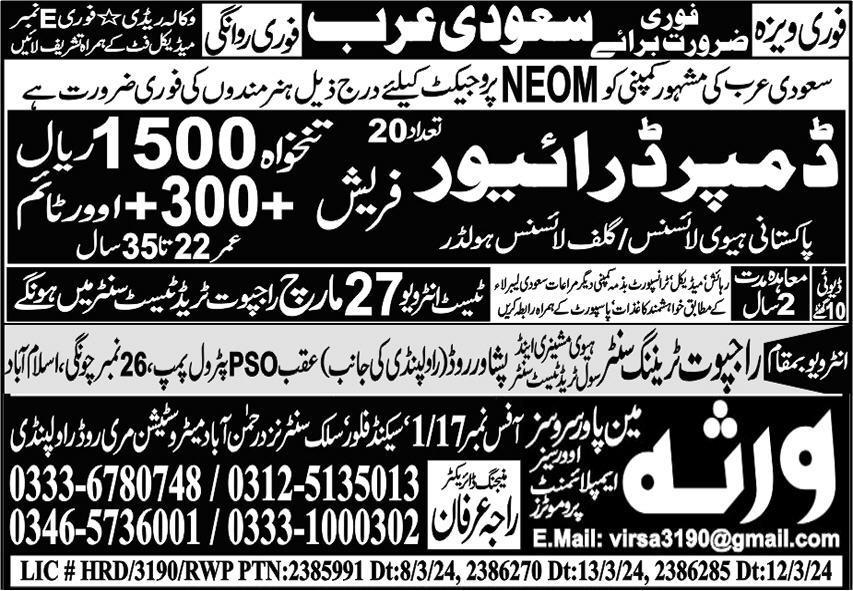 Virsa Manpower Services invites applications for job positions advertised in daily Express dated 22 March 2024 for following vacancies in Dammam, jeddah Saudi Arabia.