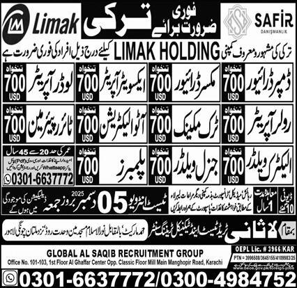 Global Al Saqib Recruitment Group invites applications for job positions advertised in daily Express dated 28 November 2025 for following vacancies in Ankara, istanbul Turkey.