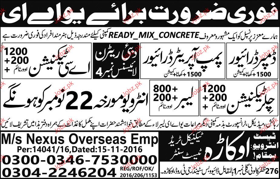 Dumper Drivers, Chiller Technicians, Labors Wanted