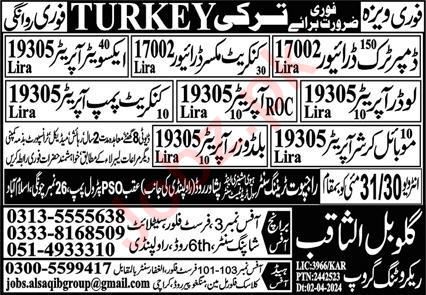 Global Al Saqib Recruitment Group jobs advertisement dated about 26 May 2024 in daily Express Newspaper invites application for the vacant post of excavator operator, concrete pump operator, buildozer operator, concrete mixer driver, dumper truck driver, mobil crusher operator, roc operator and loader operator in Ankara, ankara Turkey. Preferred Education is Intermediate and Matric etc.