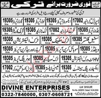 Divine Enterprises is looking for candidates for following posts as per job advertisement published in daily Express Newspaper of May 19, 2024 for location Ankara, ankara Turkey: