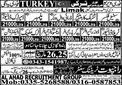 Rajput Training Center Ankara, istanbul Turkey invites applications from eligible candidates for the post of electrician, grader operator, triala driver, excavator operator, dry wall worker, truck mechanic, driver, dumper truck driver, dozer operator, shuttering carpenter, steel fixer and plumber as per advertisement of March 22, 2025 published in daily Express Newspaper. Intermediate, Bachelor and Matric etc. educational qualification will be preferred.