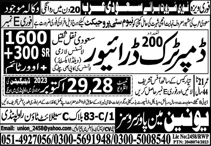 Vacant posts including driver, htv driver, dumper tuck driver, truck driver and dumper driver are announced in Union Manpower Services Dammam, riyadh Saudi Arabia as per 26 October 2023 advertisement in daily Express Newspaper. Matric and Intermediate etc. educational qualification will be preferred.