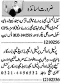 Vacant posts including english teacher, chemistry teacher, principal, biology teacher, maths teacher, teacher, head teacher, computer teacher, lady teacher and vice principal are announced in Private School Harbanspura Lahore, lahore Punjab Pakistan as per 13 October 2025 advertisement in daily Dunya Newspaper. Preferred Education is Master, MA, BA, Bachelor and M.sc etc.