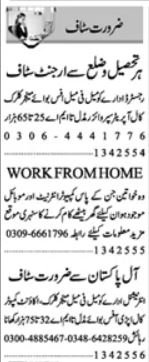 Private Company jobs advertisement dated about 14 April 2025 in daily Dunya Newspaper invites application for the vacant post of clerk, call operator, computer call operator, manager, supervisor, freelancer, office boy and accountant in Lahore, lahore Punjab Pakistan. Educational qualifications required Middle, Intermediate, B.com, Bachelor, Matric and BA etc.