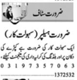 Vacant posts including shop helper and helper are announced in Private Company Lahore, lahore Punjab Pakistan as per 14 July 2025 advertisement in daily Dunya Newspaper. Educational qualifications required Primary and Middle etc.