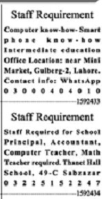 Vacant posts including school principal, teacher, principal, computer teacher, office staff, math teacher and accountant are announced in Private Company Lahore, lahore Punjab Pakistan as per 16 September 2024 advertisement in daily Dunya Newspaper. Candidates with Intermediate, BA, Bachelor, B.com, MA and M.sc etc. educational background will be preferred.