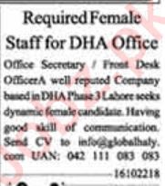 Private Company Lahore, lahore Punjab Pakistan invites applications from eligible candidates for the post of office secretary and front desk officer as per advertisement of October 17, 2022 published in daily Dunya Newspaper. Intermediate and Bachelor etc. educational qualification will be preferred.