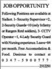 Dunya Sunday Classified Ads 23 Jan 2022 For Security Staff