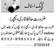 Private School Karachi, karachi Sindh Pakistan invites applications from eligible candidates for the post of quran teacher, teacher, qaria and qari as per advertisement of February 28, 2022 published in daily Dunya Newspaper. Educational qualifications required Intermediate and Bachelor etc.