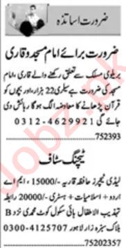 Vacant posts including qari, lady teacher, urdu teacher, hafiz, history teacher, qariah, teacher, imam masjid and islamiat teacher are announced in Private School Lahore, lahore Punjab Pakistan as per 8 May 2023 advertisement in daily Dunya Newspaper. Persons with Master, MA, M.ed, Intermediate, Bachelor, B.ed, Matric and BA etc. education can apply.