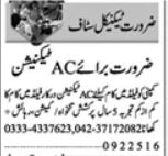 Factory jobs advertisement dated about 10 February 2025 in daily Nawaiwaqt Newspaper invites application for the vacant post of ac technician and field worker in Lahore, lahore Punjab Pakistan. Persons with Intermediate and Matric etc. education can apply.
