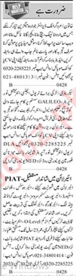 Private Company invites applications for job positions advertised in daily Dunya dated 15 May 2023 for following vacancies in Karachi, karachi Sindh Pakistan.