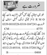Private Company jobs advertisement dated about 19 May 2025 in daily Dunya Newspaper invites application for the vacant post of nurse, nursing staff, maid, rmo, gynecologist, house maid and resident medical officer in Malir Karachi, karachi Sindh Pakistan. Candidates with DAE, Matric, Intermediate, MBBS and Middle etc. educational background will be preferred.