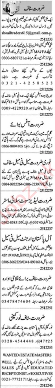Vacant posts including clerk, helper, tailor, driver, volunteer staff, manager, accountant, sanitary worker, sales executive, female office staff, store keeper, pro, office boy, public relation officer, sweeper, receptionist, call operator, tailor master and office staff are announced in Private Company Lahore, lahore Punjab Pakistan as per 26 December 2022 advertisement in daily Dunya Newspaper. Persons with Bachelor, Middle, Matric and Intermediate etc. education can apply.