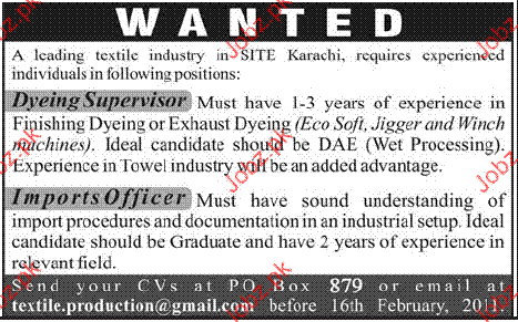 Dyeing Supervisor And Imports Officer Job Opportunity