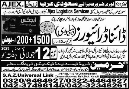Harmain Trade Test & Technical Training Center jobs advertisement dated about 8 July 2025 in daily Express Newspaper invites application for the vacant post of delivery driver, driver and dyna driver in Jeddah, dammam Saudi Arabia. Candidates with Intermediate and Matric etc. educational background will be preferred.