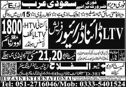 New Al Falah Trade Test & Training Center jobs advertisement dated about 17 May 2025 in daily Express Newspaper invites application for the vacant post of ltv driver, driver, dyna driver and htv driver in Dammam, riyadh Saudi Arabia. Candidates with Intermediate and Matric etc. educational background will be preferred.