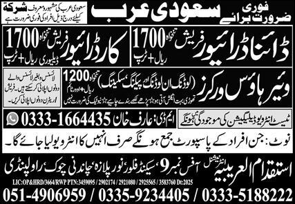 Istaqdam Al Arabia International jobs advertisement dated about 19 November 2025 in daily Express Newspaper invites application for the vacant post of warehouse worker, unloading worker, driver, car driver, packing worker, loading worker, htv driver and dyna driver in Jeddah, dammam Saudi Arabia. Preferred Education is Matric and Intermediate etc.